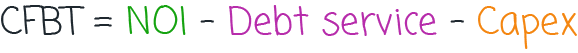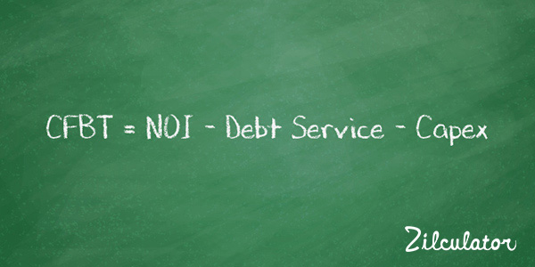 When you speak about cash flow you usually mean cash flow before taxes (CFBT) which does not take into account the property's impact on the owner's income tax liability. Cash flow after taxes (CFAT) is the CFBT less any tax liability that arises from the operation of the property.